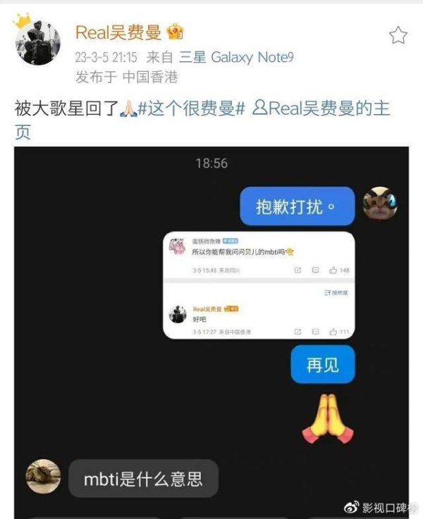 有好奇网友问了这个成天在网络第一线冲浪的星二代当年同一季参加《爸爸去哪儿》的贝儿,也就是陆毅的大女儿的近况。费曼这个无聊到爆炸的青少年义不容辞地帮大家做起来这个八卦记者,最后给大家贴出来了贝儿的mbti(一种性格测试),并且说了一句被大歌星回复了。