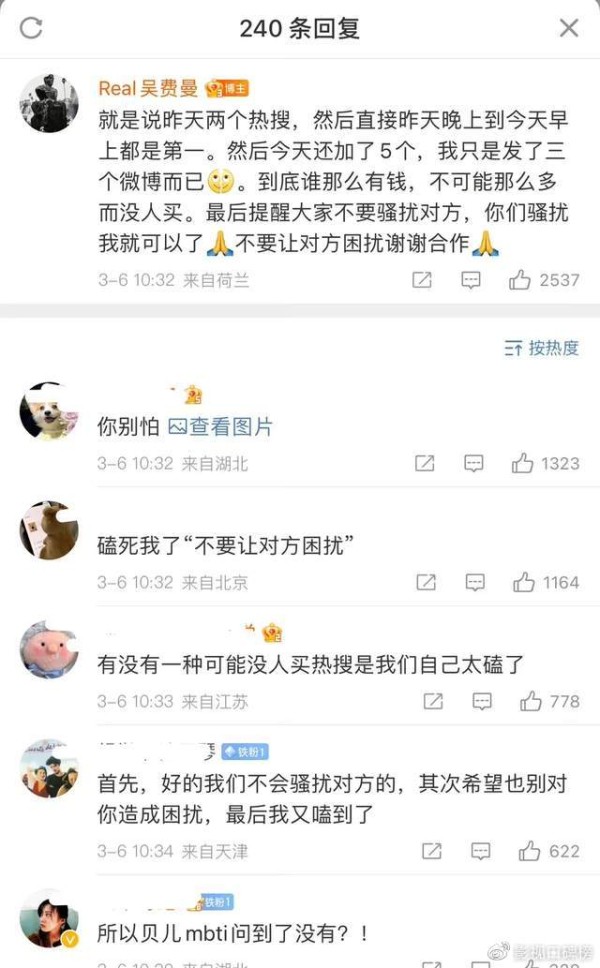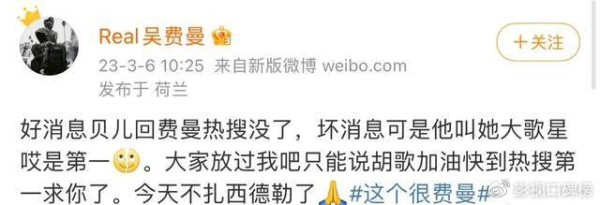 这可让费曼惹得大祸,热搜这个玩意,平常得花几十万才能上的东西,就这么让他轻而易举地给霸榜,直接攀升到了第一。费曼自己都说到底是谁这么有钱,而且还一再拜托网友们说:“你们骚扰我就可以了,千万不要让贝儿产生困扰。”大家一边笑费曼就等着陆毅过来打你吧;一边感觉这对CP怎么越来越好嗑了。