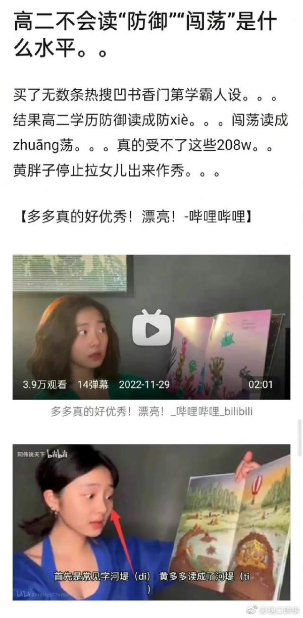 不过,也有人因此翻了车。同样还是和贝儿、费曼一起参加《爸爸去哪儿》的多多,最近是被赶到了风头浪尖之上。原因是她自己做了一个vlog分教小朋友读书,但是读出来的却错字连篇。关键她不是读错了一些生僻字,作为一个高二的学生,犯的都是一些基础性错误,就算是没看清楚,按照常识来说,也不可能把防御都成防卸、流淌看成流尚,这都有点让人无法理解。
