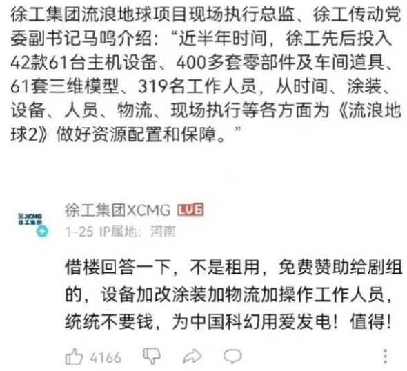 徐工集团直接赞助了42款61台大型设备,按剧组要求进行各种改装,派出了319人队伍跟组半年服务,全部白送,主动自觉的用爱发电。