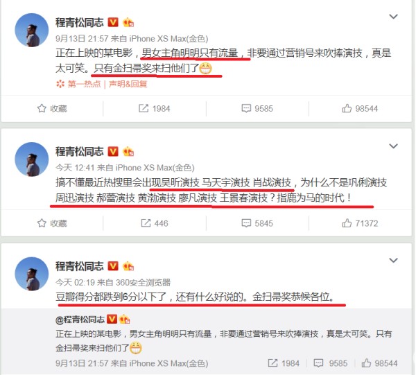 本来职业影评人遇到诛仙这个流量电影都已经噤声不敢评论了。粉丝装路人安利打五星配合水军刷分,配合豆瓣锁分在刚上映的时候靠虚假的分数骗了2天钱,。档期不错,能骗更多,程青松评价了诛仙不好,上了热搜然后粉丝扒程青松黑料,涉及到了郑渊洁,郑渊洁就躺枪了、被造谣 !