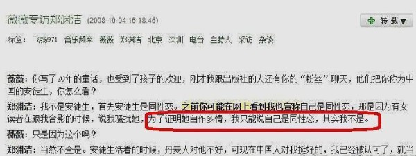 然而郑渊洁说的是声称自己是同性恋,是因为有女读者在跟他合影的时候,说郑渊洁骚扰她。郑渊洁不得已用“同性恋”来证明她是自作多情,实际上他不是。