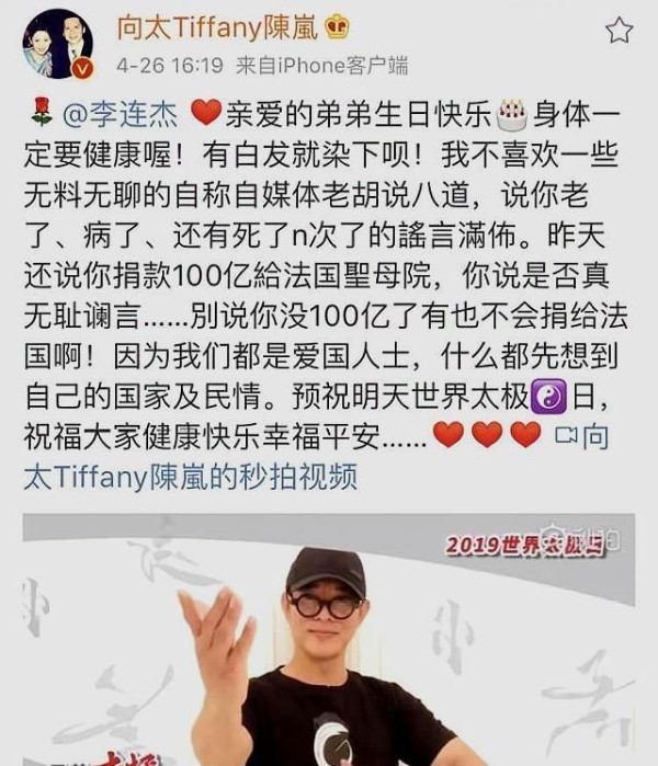 在4月20号是功夫皇帝李连杰的生日,然而在圈内却很少有人给她送上祝福,只有刘亦菲,霍尊和,向太向佐等极少数,圈内的明星给他送上祝福。