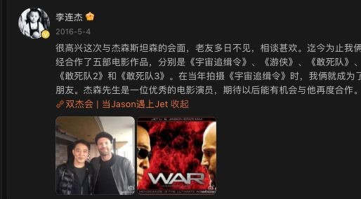 这也不是李连杰第一次为杰森站台:2016年他亦在微博发布两人合影,并盛赞杰森“是一位优秀的电影演员。”