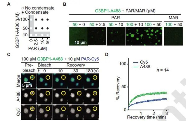 C9ORF72基因中的GGGGCC六核苷酸重复扩增是肌萎缩侧索硬化(ALS)和额颞叶痴呆(FTD)最常见的遗传原因。其中,富含精氨酸的DPR(R-DPR)在细胞或动物模型中过表达时毒性显著。R-DPR与许多应激颗粒(SGs)相互作用,这有助于神经退行性变的发生。聚(ADP-核糖)(PAR)可在翻译后修饰蛋白质,在SGs的组装中发挥至关重要的作用。