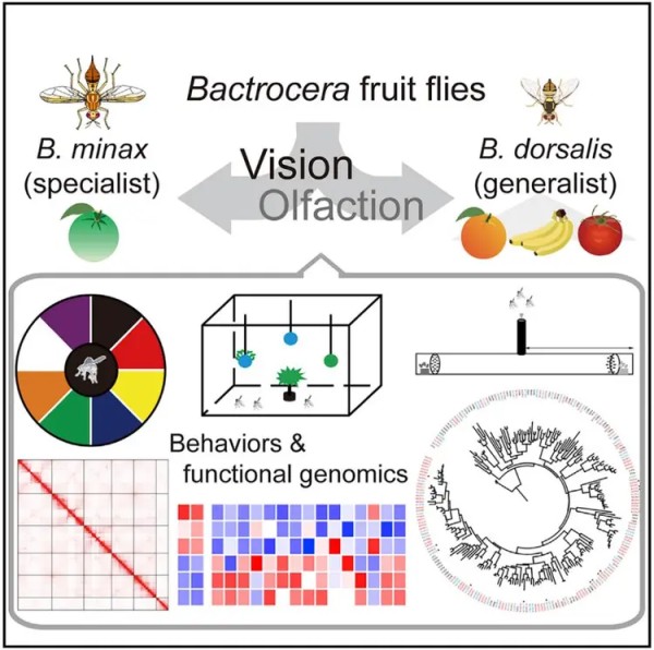 昆虫是地球上生物多样性最为丰富的动物类群。近日,华中农业大学牛长缨教授团队与中国科学院分子植物科学卓越创新中心詹帅研究员团队合作,以专食性柑橘大实蝇和多食性橘小实蝇为研究对象,综合利用基因组学、比较转录组学、行为学和分子遗传学等手段,解析了两种近缘种实蝇行为与食性差异的分子机理。