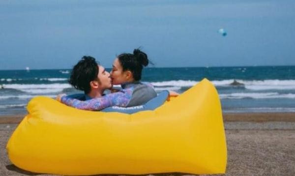 钟丽缇和张伦硕两个人在沙滩上紧紧的抱在一起,而且钟丽缇还非常俏皮的将自己的头发挽成了一个丸子头,从侧面照来看,