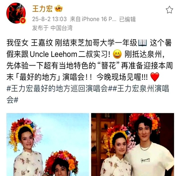 要说这姑娘可不简单,名叫王嘉纹,刚在芝加哥大学读完大一。暑假回国跟着叔叔实习,准备接下来的演唱会。两人在泉州老街溜达的时候被路人拍到,王力宏一点明星架子都没有,跟普通人家叔叔带侄女逛街一个样。在非遗店铺里,他指着簪花跟侄女解释:"这可是闽南传统工艺,每一片花瓣都是手工做的。"店员后来回忆说,王力宏特别认真,还用英文给侄女翻译,那场面温馨得让人羡慕。