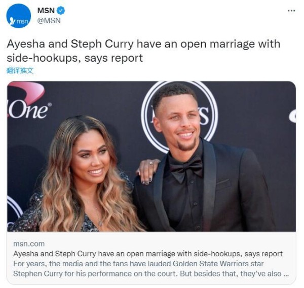 北京时间12月22日,来自微软旗下的媒体爆出令人感到不可思议的消息。来自著名八卦页面Deuxmoi上的匿名消息显示:一直以来以好男人示人的勇士巨星史蒂夫·库里,和他的妻子阿耶莎在保持恩爱婚姻的前提下,各自婚姻中有“旁观者”的存在。这一消息目前并未得到两人证实,但已经冲上美国热搜。