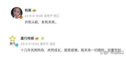 5月8日,著名演员杨幂通过个人微博发文官宣与嘉行传媒结束合作关系。同时,嘉行传媒发文:“十几年风雨同舟,共同成长,感恩感谢。祝未来一切顺利,珍重安好。”