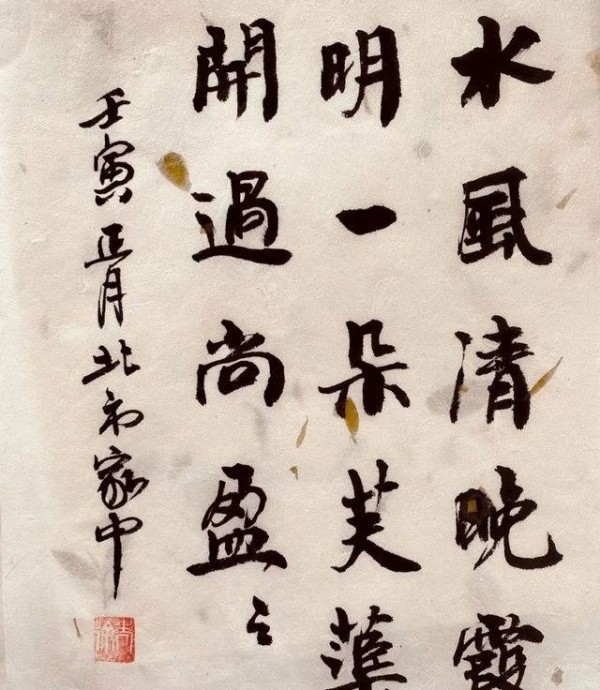 徐静蕾近期的书法作品呈现出了新的风格转变,她明显地吸收了颜体楷书的特点。她的笔触变得更加厚重,尤其是竖画部分,墨色显得更加饱满和坚实。在笔画的转折处,她倾向于使用圆润的笔法,随着笔势的推进,墨迹逐渐加重,整体上给人以沉稳而内敛的感觉。与她早期作品中那种泼辣、率性的风格相比,现在的书法显得更为缓慢和审慎。