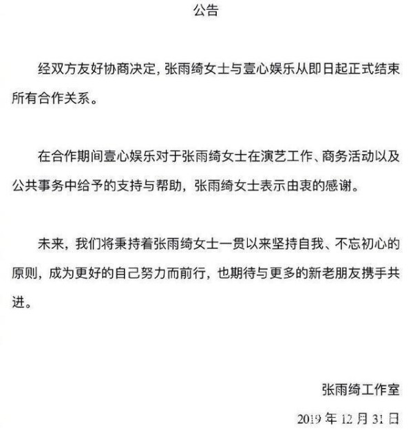 2019年12月31日,张雨绮工作室发布声明,表示和壹心娱乐结束所有合作关系。请注意这份声明,并没有强调是“合约期满”,所以有可能是提前终止,或许相处不愉快了。张雨绮一离开杨天真,马上就联系李诞,想说脱口秀。