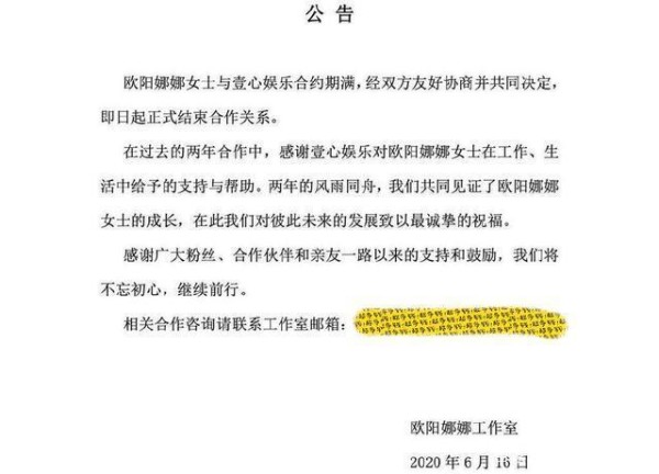 2020年1月2日,壹心娱乐发布声明,表示和陈数的经纪合约期满,将由经纪合作关系转为商务独家代理合作关系。2020年6月16日,欧阳娜娜工作室在微博发布公告,表示欧阳娜娜与壹心娱乐两年合约期满,经双方友好协商并共同决定,即日起正式结束合作关系。