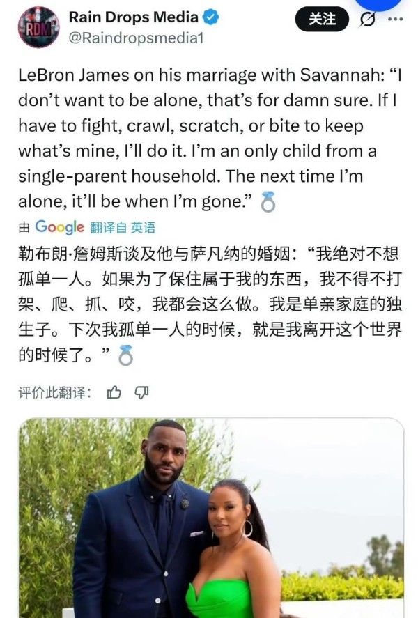 更难得的是,詹姆斯从不掩饰对妻子的依赖。 获得历史得分王时,他第一句话是感谢萨瓦娜。 被问及过去十年最佳瞬间,他毫不犹豫说是娶萨瓦纳的那一刻。 这些公开表白持续了二十多年,从未间断。