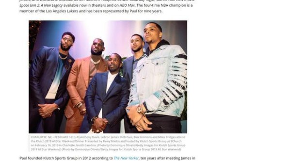 老詹经纪人里奇·保罗也并非泛泛之辈,作为老詹的经纪人兼好友,本身就是一个不平凡的头衔。此外,老詹也一直积极帮里奇招募球员,现在包括追梦格林、特雷·杨、沃尔、西蒙斯、布莱德索等人,都是里奇·保罗麾下的球员,如今他手中一共有28名球员,这些球员的合同综合达到了十亿美元以上,他也成为了NBA圈子里面最知名的经纪人之一,单单佣金就能让他坐收2000到3000万美元的年收入。