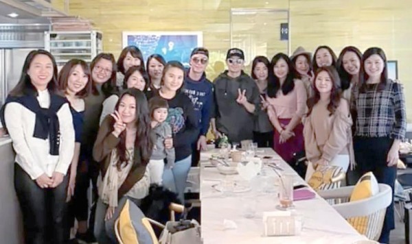 在合影中,霍建华与林志颖并肩而立,占据着中心位置。他们共同戴着鸭舌帽,穿着带有帽子的卫衣,配上酷炫的墨镜,遮面微笑,展现出如出一辙的默契。林志颖更是兴奋地对着镜头比出剪刀手,流露出愉悦的心情。周围则有15位美女相伴,场面热闹而温馨。