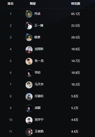 然后那就是邓伦,他在该榜单中排在了第6名。别看现阶段的伦伦每天有作品,但粉丝们给力呀,整天跑到主页上给他送鲜花,以至于让名次排在了第6名上。这对于粉丝来说,也是比较欣慰的。
