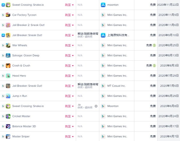 沐瞳科技成立以来,推出游戏的频率并不高,但是在2020年却疯狂地发布了57款游戏。这些产品多为休闲游戏,并且绝大部分都只登陆了 Android 平台。现今这些游戏大多数已经下架,只留下了12款。这些游戏多表现平平,贪吃蛇玩法的《Sweet Crossing: Snake.io》还算不错,在东南亚市场主要国家曾进入 Google Play 游戏下载榜 Top10。