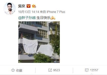 德云社孙越今日生日, 好友吴京直接送上超大白色裤衩吴京晒大裤衩照为孙越庆生,众多武打明星中,吴京却是最幸福的