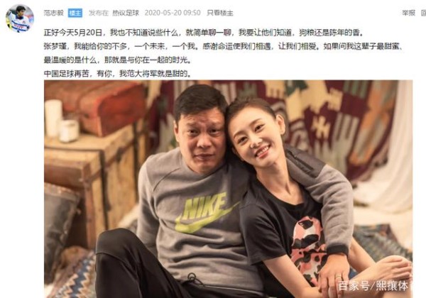 5月20日,是一个浪漫的日子,前国脚范志毅也行动了,他发帖向小17岁的娇妻张梦瑾示爱:“中国足球再苦,有你,我范大将军就是甜的。”
