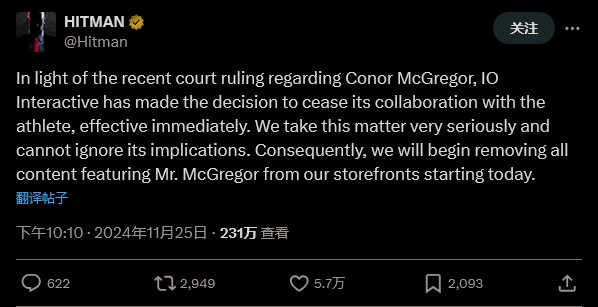 在社交媒体上,工作室发表声明称:“鉴于最近法院对康纳·麦格雷戈的裁决,IO Interactive 已决定停止与该运动员的合作,立即生效。”