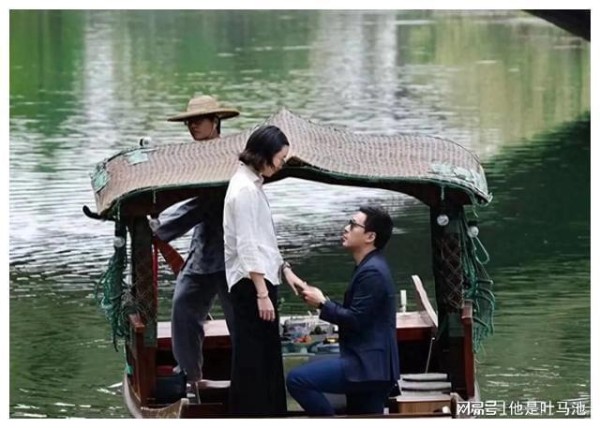 在一片宁静的湖面上,一艘小船轻摇,霍启人身着传统中山装,单膝跪地,向女友献上了求婚戒指。