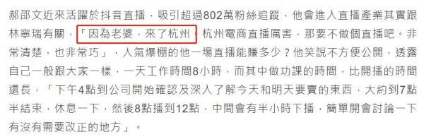 郝劭文透露,他之所以会走上直播带货之路,其实跟妻子有关。他说当初因为妻子,他来到杭州定居。看着杭州的电商直播那么厉害,便尝试做一下。