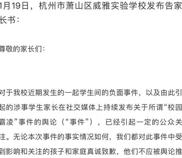 郝邵文女儿所在学校于1月19日发布了一篇长文声明,该声明指出,关于郝邵文女儿所遭遇的事件,并不是校园霸凌,而只是同学间的不小心打闹。校方经过调查后得出了这一结论,并称郝邵文一家利用明星身份以及舆论故意将事情夸大化,同时还提供了多项证据来支持他们的观点。