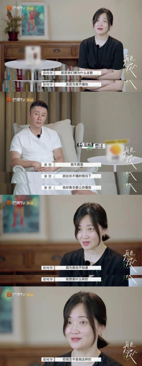 节目中两人再见面,始终保持着距离,对彼此是无言的状态。在他人的追问下谈及婚姻状态,他们都不愿意放下骄傲,争相比赛着谁更能刺痛对方似的。郭柯宇说:“我的世界他进不来,他的世界我也不太想去。”章贺就来一句:“其实我们各自都不想去。”郭柯宇说:“我那段时间不太想用心用劲地把自己放进来,累了。”章贺说:“你也没放进来过。”