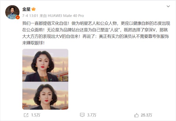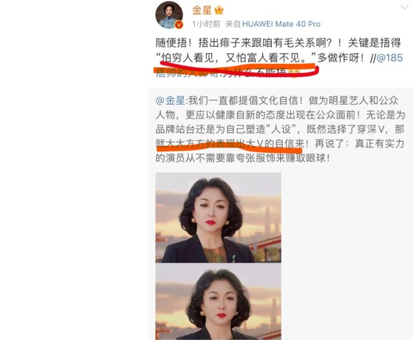 咱们先看看事情起末吧。金星之前先是发了一篇微博,发表了自己的观点,公众人物应该大大方方的展现自己,并且既然选择了性格服装,就要用自信将自己大大方方的表达出来,不论是为了“给品牌方站台”还是自己塑造人设。