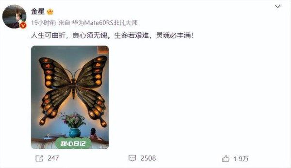 10月26日中午,金星再度发微博,回应了前段时间的舆论争议,原文如下:“人生可曲折,良心须无愧。生命若艰难,灵魂必丰满!”看得出来,金星对于网友的指责非常不认同,她坚定的认为自己的言行举止没有任何问题,也对得起自己的灵魂和良心。