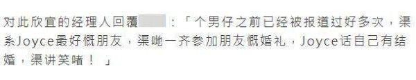 然而没过多久郑欣宜的经纪人并发文回应该消息,表示“那个男人之前已经被报道过很多次,他只是郑欣宜最好的朋友,两人一起参加朋友的婚礼而已,郑欣宜说自己有结婚,那是开玩笑的。”