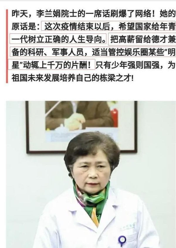 李兰娟院士说,这次疫情过后,应该要根据个人的付出来得到回报。