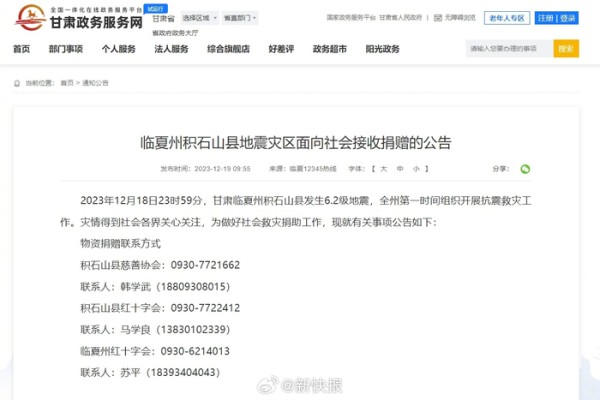 【#多位明星为甘肃地震捐款捐物#】#关注甘肃地震现场# 北京时间12月18日23时59分,甘肃临夏州积石山县发生6.2级地震。甘肃省政务服务网发布《临夏州积石山县地震灾区面向社会接收捐赠的公告》,公布物资捐赠联系方式↓↓ 19日,韩红、黄晓明、林志玲、张天爱、佟丽娅等明星为甘肃地震捐款捐物。愿平安!#甘肃地震亲历者说逃生后手和腿一直在抖#