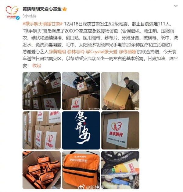 多位艺人明星向甘肃地震灾区捐赠物资和资金