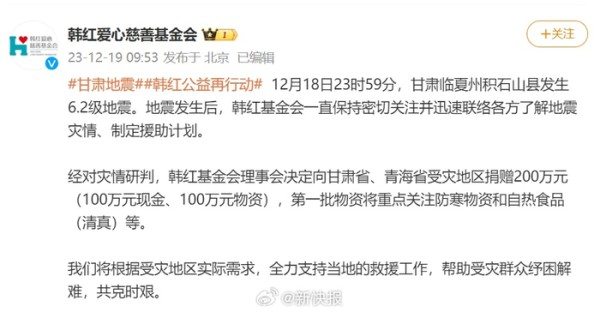 韩红、黄晓明等多位明星艺人为甘肃地震捐赠