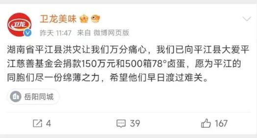 湖南麻辣王子、卫龙美味、盐津铺子等品牌,也纷纷捐赠善款与物资,为防汛救灾工作贡献自己的力量。