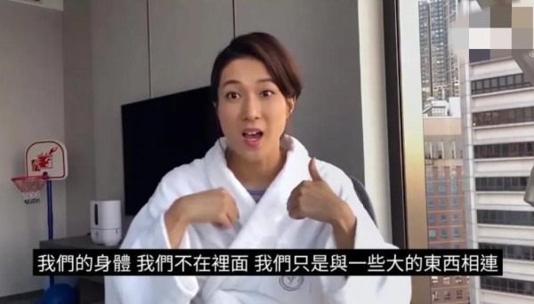 钟嘉欣在返港之后经过了长时间的隔离,还分享了自己在隔离时的动态。她穿着浴袍打扮朴素,看上去非常接地气。