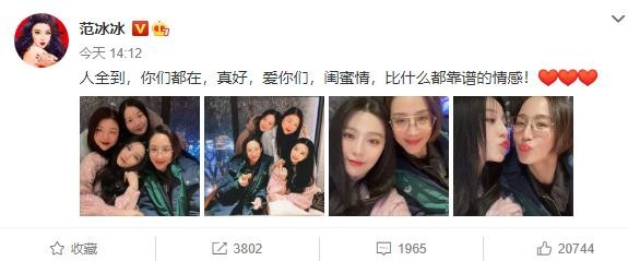 范冰冰除去多张的合照之外,她还在配文中说道:”人全到,你们都在,真好,爱你们,闺蜜情,比什么都靠谱的情感!。“罕见的看到范冰冰这么的煽情。不过有一句老话说:”患难见真情。“一点都不假。这几位还能够和范冰冰曝出如此要好的关系,可见她们之间的感情是真的好吧。