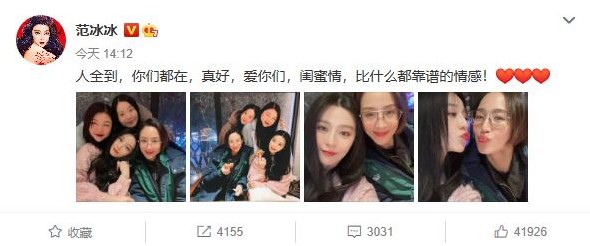 而我们都知道,范冰冰除了工作以外,很少会谈及到个人感情,无论是爱情也好,还是友情也罢,即便真实存在过,也不会轻而易举表达出来。但这次她的配文十分暖心动人,“人全到,你们都在,真好,爱你们,闺蜜情,比什么都靠谱的情感”。
