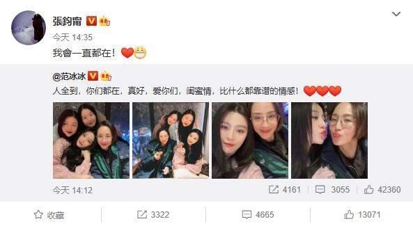 既然是闺蜜,那必然是事事有着落,件件有回音,范冰冰发文没过多久的时间,张钧甯通过微博转评了对方的微博,并配文称“我会一直都在”。可想而知,二人关系是真的很好很好,毫无问题可言,毫无瑕疵可挑。