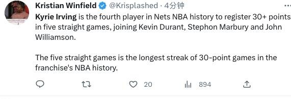这是欧文连续第5场30+,追平了生涯最长纪录。上一次是2019年3月效力凯尔特人时完成的,换句话说,这是他篮网生涯最佳表现。与此同时,他也是篮网队史第四个能完成这样表现的球员,其他3人分别是约翰-威廉森、马布里和杜兰特。