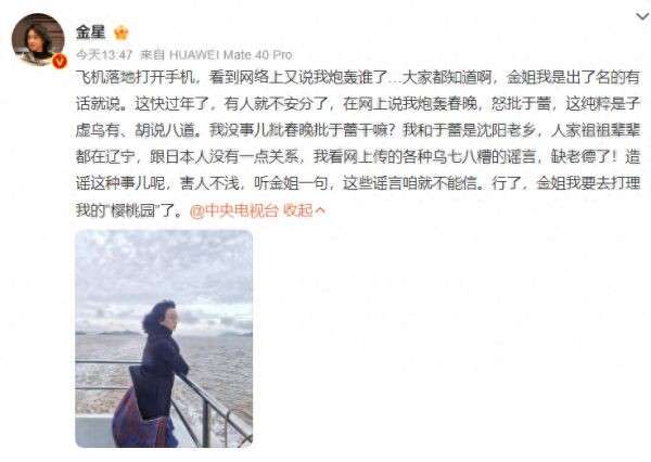 1月18日中午,金星在社交账号发文回应网传的“金星炮轰春晚”的传闻。