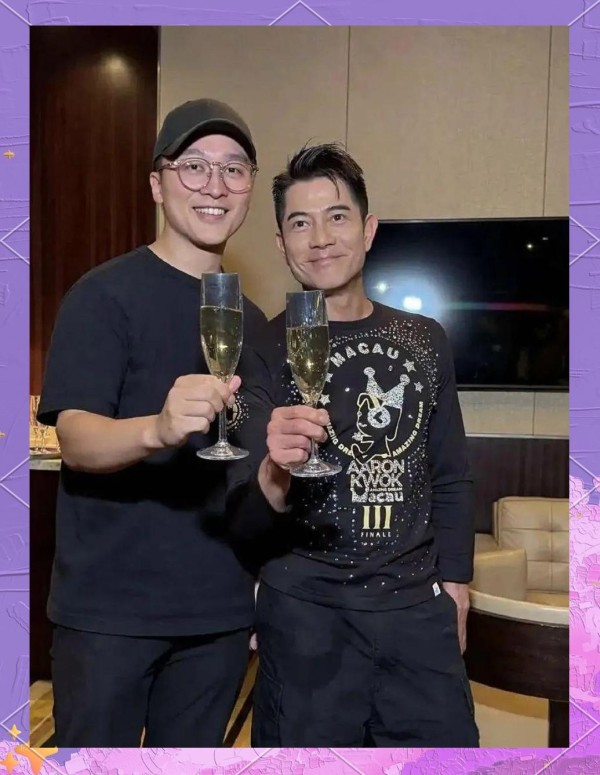 在后台的合照中,刘嘉玲身着一袭黑色亮片裙,肩膀处巧妙的设计增添了几分优雅气质。郭富城则站在她身旁,手持香槟,另一只手亲切地搭在她的肩上,两人亲近的姿态透露出深厚的情谊。有细心的网友发现,在合照中香槟杯上所印的“梦幻武林”logo,极有可能是郭富城演唱会的专属定制。这一细节似乎透露着两人是为这场演唱会而特地聚首庆祝的。