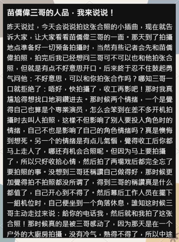 苗侨伟坚守先完成工作再合影的准则,不仅表达了他对表演事业的敬重,更彰显了他言出必行的坚定品格。纵观娱乐圈,不乏“耍大牌”的现象:诸如明星对粉丝冷漠无视,拍戏时迟到早退,甚至公开对合照粉丝的“档次”表示不满。