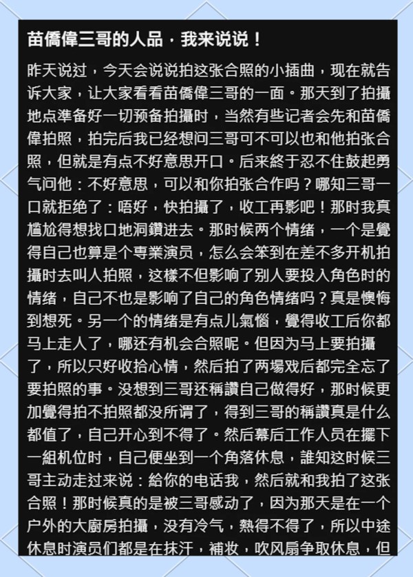 同时,一位名为“香港演员刘云龙,坐标深圳”的粉丝在小红书上以“苗侨伟三哥的人品,我来说说!”为题,讲述了与三哥的一段小故事。原来,在某次拍摄现场,当记者们纷纷与苗侨伟合影时,刘云龙也渴望能与三哥拍张照,却因害羞而迟迟未开口。最终,他鼓起勇气向三哥提出请求,却意外遭到拒绝。三哥笑着表示,拍摄快开始了,收工后再拍照吧。这让刘云龙当时感到十分尴尬,恨不得找个地洞钻进去。