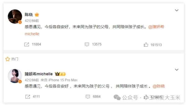 昨天,陈晓与陈妍希以一句“感恩遇见,未来同为孩子的父母”官宣离婚,迅速引发全网热议。