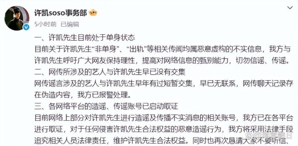许凯工作室也出来表态:非单身、出轨都是假的。