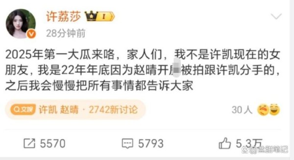 她自称是许凯的前女友,两人在2022年年底分手,原因竟是许凯与同公司女星赵晴被拍到酒店KF。