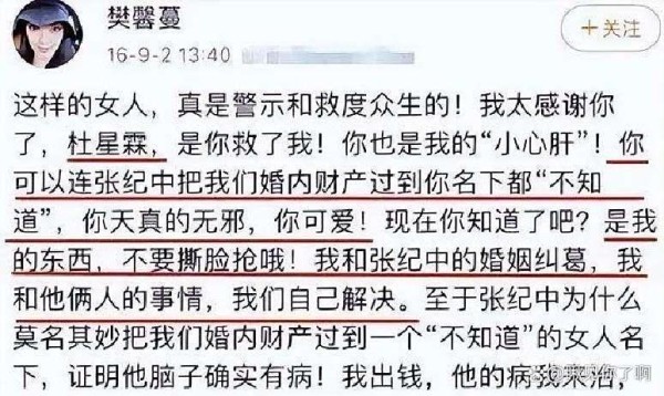 但换个角度想,她这么激动的反应可能也反映了一些实际问题。如果真是因为爱情走到一起,那又何必用这样的方式去证明呢?当初杜星霖说自己是被张纪中的才华吸引,但你试着想一下,如果张纪中没有那么辉煌的事业,没有钱没有资源,你觉得她会选择嫁给一个比自己大31岁的男人吗?这答案其实每个人心里都有数。